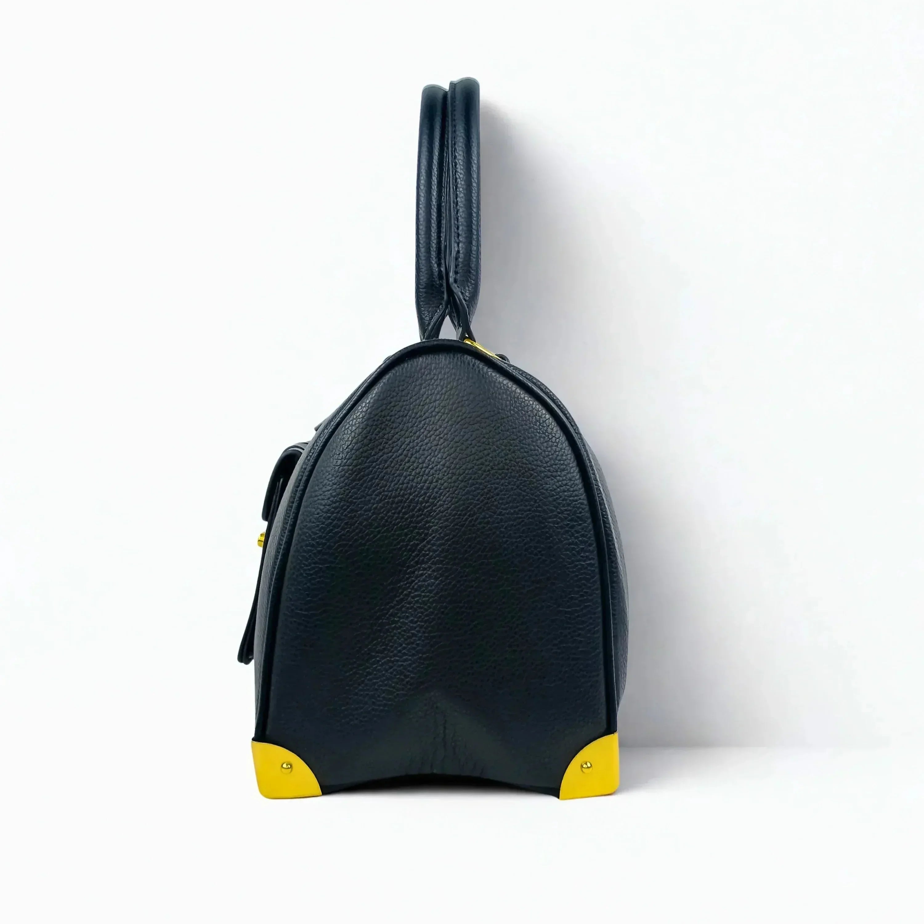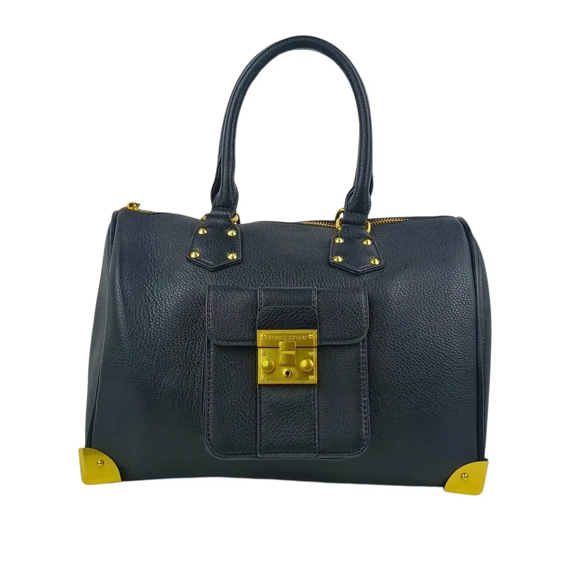 The Enrico Doctor Bag is made from premium black leather and features dual handles along with a removable shoulder strap for versatile carrying options. It includes a spacious main compartment suitable for clothing, workout gear, or daily essentials, and a lined interior for added durability.